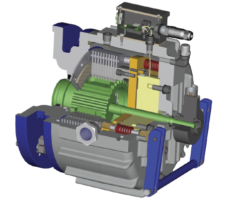 Proven oil shear technology transmits torque between lubricated surfaces—thereby eliminating wear on friction surfaces. A patented fluid recirculation system dissipates heat—eliminating heat build-up which is the most common problem in dry braking systems. Elimination of the wear significantly increases service life and virtually eliminates adjustment which also elongates maintenance intervals. The oil shear technology also provides a smooth “cushioned” stop which reduces shock to the drive system, further extending service life of downstream components.
