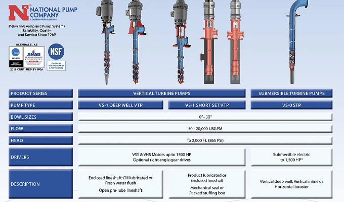 National Pump Company’s certified pumps include both vertical and submersible turbine pumps. The deep-set Vertical Turbine Pumps are available in configurations that include either oil-lubricated or fresh water flushed enclosed lineshaft or pre-lubricated open line shaft. The short-set vertical turbine pumps are available in either product lubricated or enclosed lineshaft configurations.
